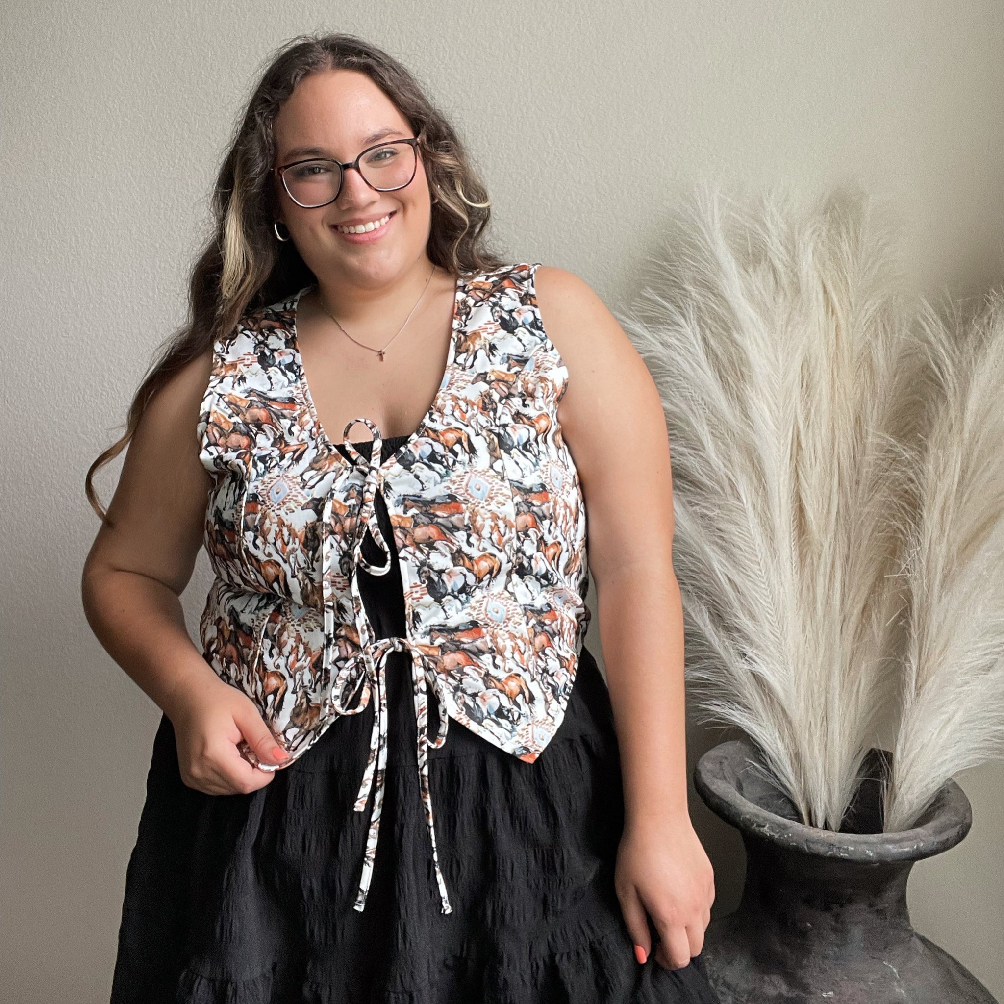 The wild west just got a fashion upgrade. Meet the Buckaroo Vest — a playful, prairie-inspired piece featuring an all-over horse print and lace-up front ties for that perfect touch of cowgirl charm. With its flattering cut and soft structure, this vest brings fun, movement, and personality to any outfit. Throw it over a tee or a flowy dress and you’re front row ready — whether it's a rodeo, market day, or just showing up cute at brunch.
