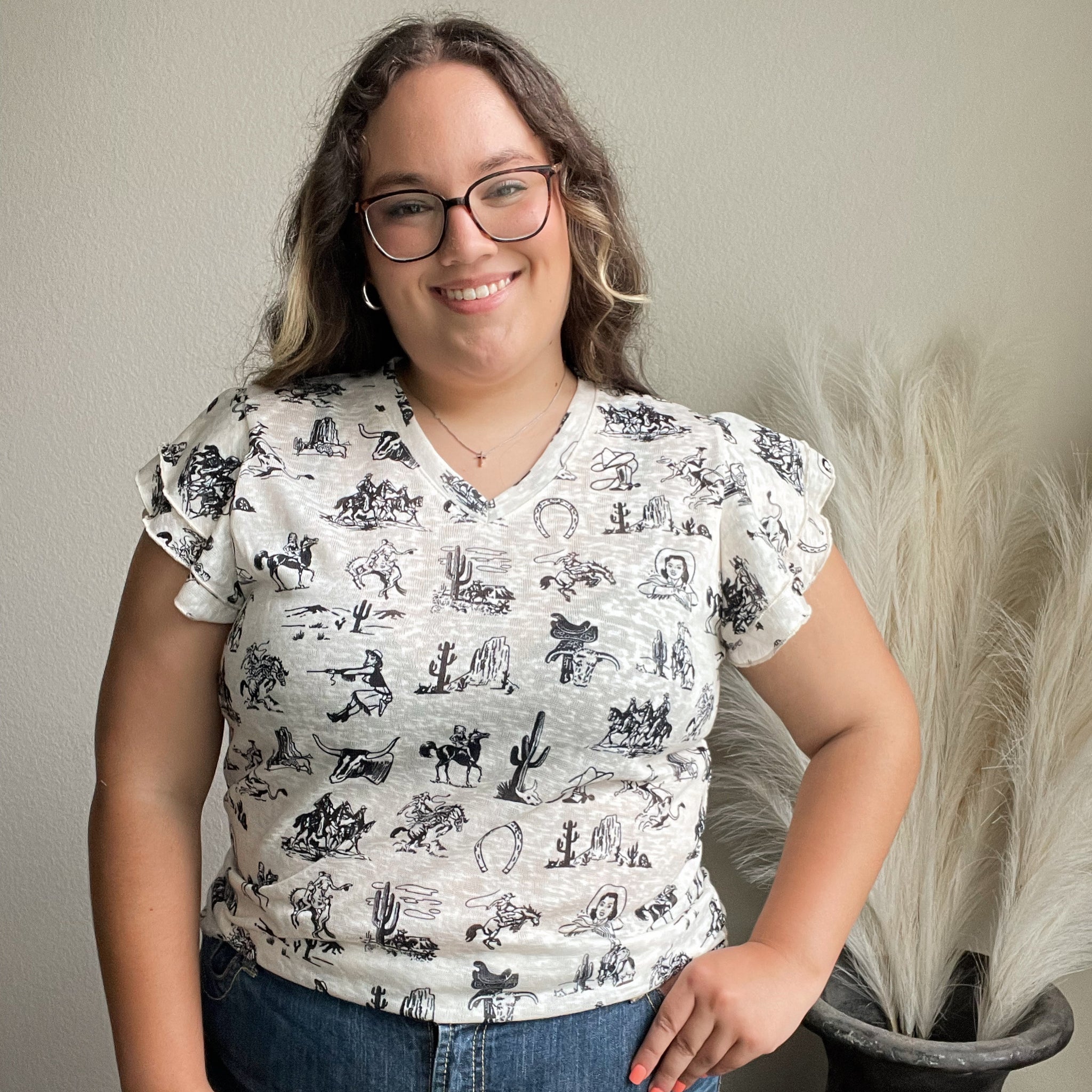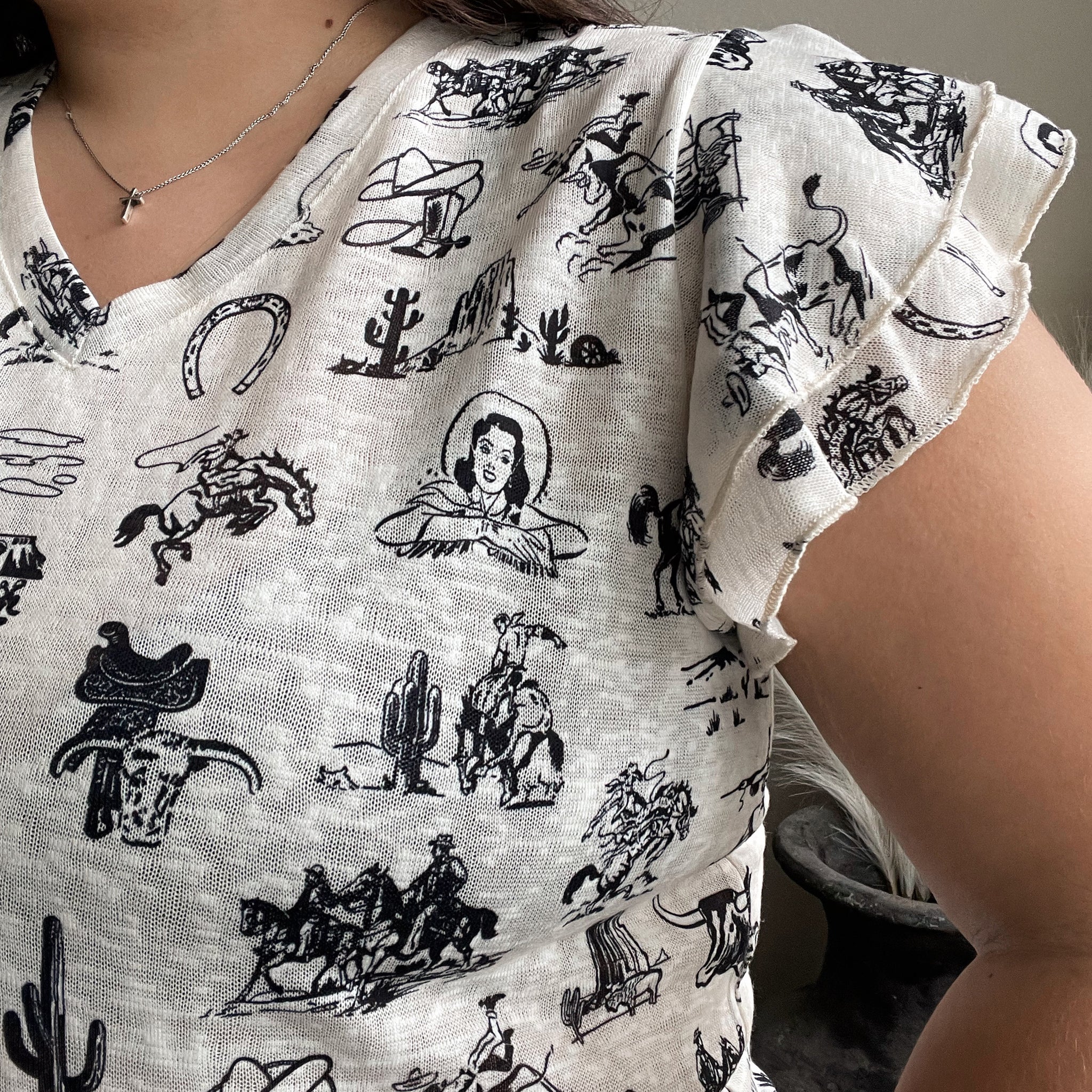 Channel your inner vintage soul with the Outlaw Top. This soft burnout tee features hand-drawn style sketches of cowboys, cacti, broncos, lassos, and desert scenes, making it a standout staple for any wild-at-heart gal. The flutter sleeves add a sweet, feminine touch, while the v-neck keeps it easy to layer.